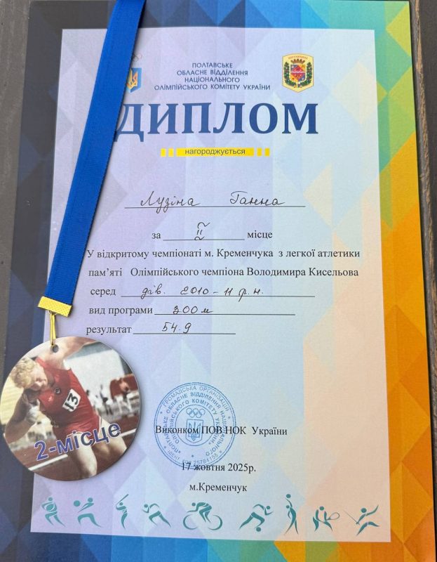Вітаємо студентку групи ФКС-11Ф Ганну ЛУЗІНУ, яка виборола почесне ІІ місце у Відкритому чемпіонаті м. Кременчука з легкої атлетики пам’яті Олімпійського чемпіона Володимира Кисельова!