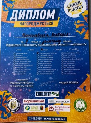 Вітаємо здобувача освіти групи ФКС-11Ф Вікторію КОНІШЕВСЬКУ з вибореним ІІ місцем у «золотому фіналі» відкритого чемпіонату Хмельницької області з чирлідингу – 2026 серед юніорів у номінації Cheerleading Team All Female ✨.