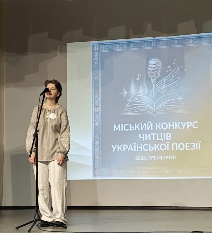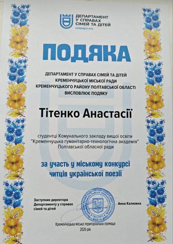 Вкотре у Кременчуці відбувся міський конкурс читців української поезії, який об’єднав поціновувачів українського поетичного слова. Навколо події об’єдналися учнівська та студентська молодь. У поетичних читаннях взяли участь здобувачки освіти Кременчуцької гуманітарно-технологічної академії, серед яких Анастасія Тітенко, студентка групи КН-22Ф спеціальності «Комп’ютерні науки», та Вікторія Омеляненко, студентка групи УМ-11Ф спеціальності «Середня освіта. Українська мова та література». Учасниці конкурсу декламували поезію Тараса Шевченка «До Основ’яненка» та авторський вірш «Жили ми мирно, горя і не знали», який написала Вікторія. Неймовірний образ, створений виконавицею, підкреслив важливість янгола-охоронця у житті кожної людини, особливо у часи важких випробувань. Учасницям конкурсу вдалося переконати глядачів і членкинь журі своєю артистичністю, передати емоційність, захопити сценічною виразністю голосу, продемонструвати оригінальність творчої манери, вразити зовнішнім виглядом.