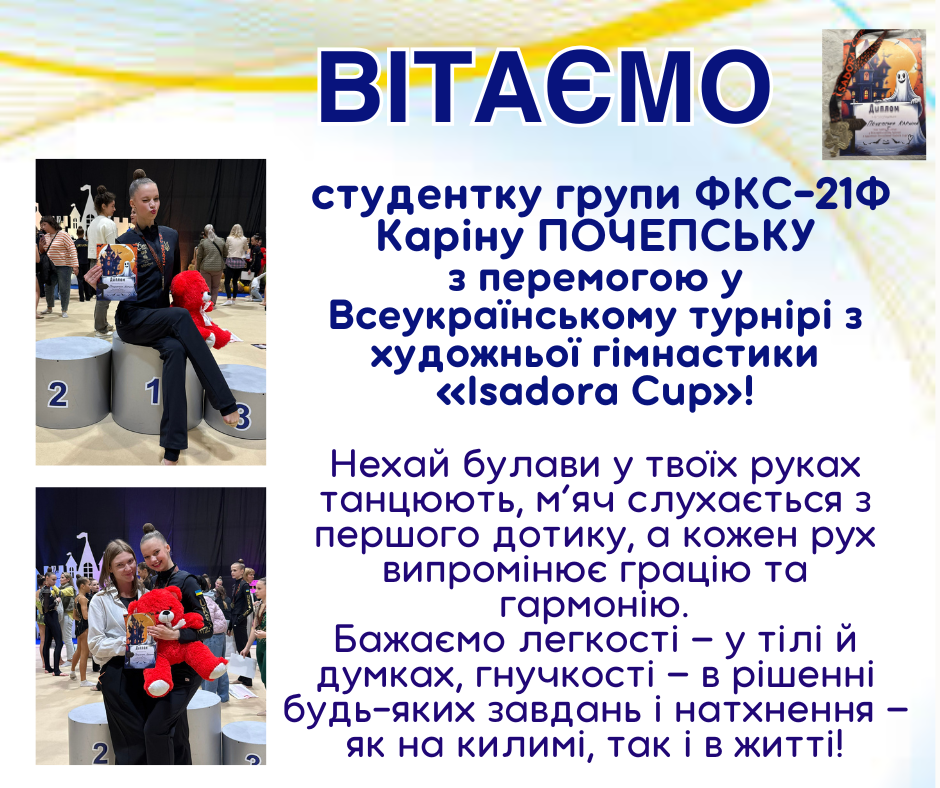 З 5-го по 12-те жовтня 2025 року в м. Єзоло, Італія відбувся XХIII Чемпіонат Світу з Таеквон-До І.Т.Ф. серед юніорів, дорослих та ветеранів. У змаганнях взяли участь понад 1200 найкращих спортсменів, більше 2500 учасників із 72 країн світу. Національну Збірну України представляли 100 спортсменів, серед яких наша студентка другого курсу відділення початкової та технологічної освіти […]