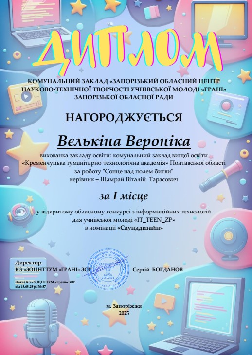 30 квітня 2025 року на базі Полтавського університету економіки та торгівлі (Полтавський університет економіки і торгівлі #ПУЕТ) відбувся ІІ Фестиваль повітряної робототехніки імені Юліана Матвійчука, у якому взяли участь студенти нашого фахового коледжу Віолета Галай та Олексій Парасочка, а також учні ліцею “Політ” (Ліцей «Політ») Вацлав Сідоровський і Анастасія Григоренко. У змаганні з пілотування FPV-дроном […]